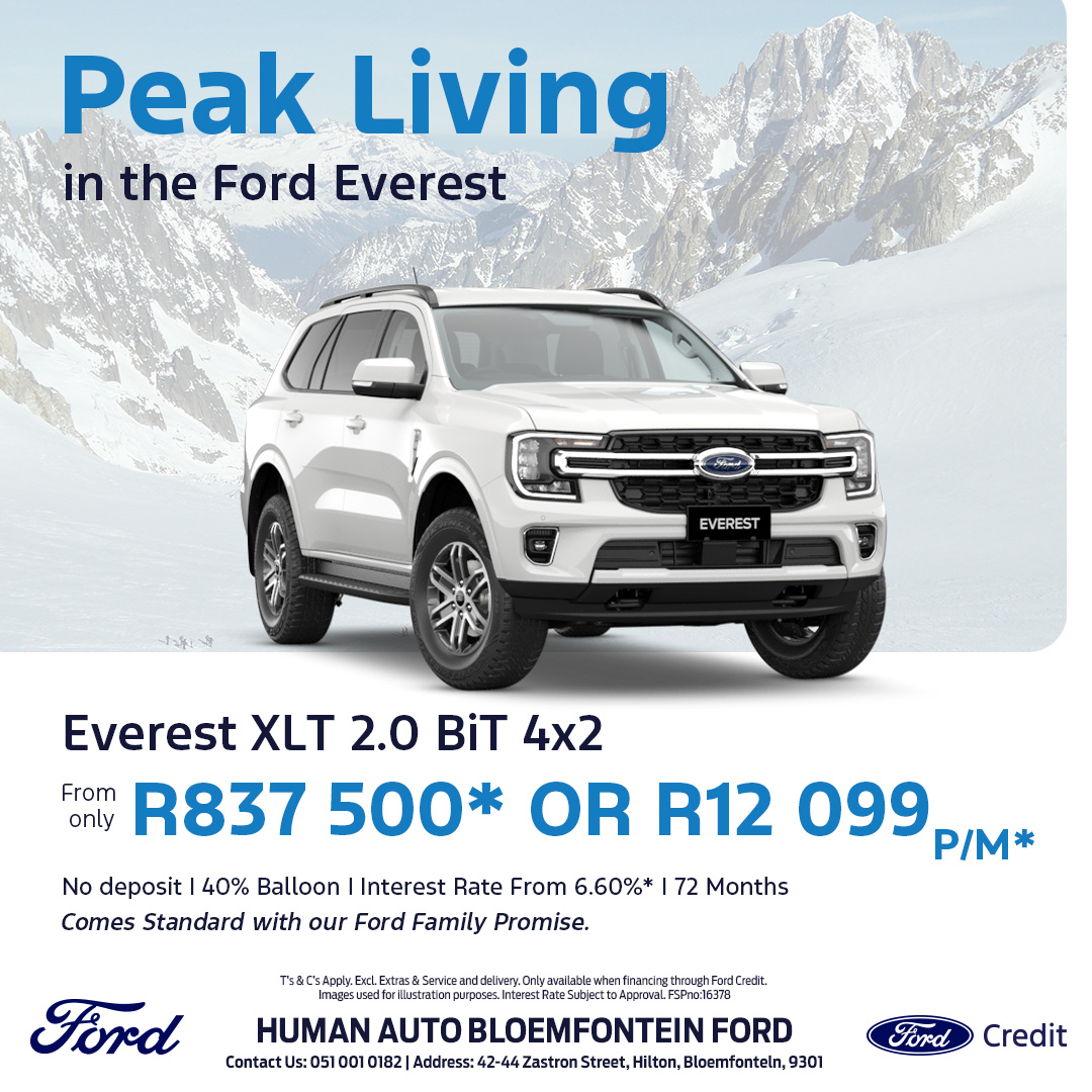• Ford reserves the right, subject to all applicable laws, to discontinue or change features and other specification either temporarily or permanently without incurring any liability to any prospective purchaser or purchasers.* Fuel economy and emission figures obtained from controlled tests on a combined cycle. Note that the actual fuel consumption and emission will depend on many factors including your driving habits, prevailing conditions and your vehicles equipment, condition and use. Ford reserves the right, subject to all applicable laws, to discontinue or change features and other specification either temporarily or permanently without incurring any liability to any prospective purchaser or purchasers. ** Leather is a combination of leather and high-quality, durable materials. Consult the vehicle handbook, www.ford.co.za or your nearest Ford Dealer for more information regarding Ford PROTECT plans and products. Driver-assist features are supplemental and do not replace the driver’s attention, judgment and need to control the vehicle. May not operate at certain speeds, or in certain driving, road or weather conditions. Bluetooth® is a registered trademark of Bluetooth SIG, Inc. and is under license. Some phones are not compatible. Wireless Charging only available with compatible phones Apple CarPlayTM/Android AutoTM requires phone with compatible version of Apple iOS/AndroidTM (as applicable). Apple / Google and other third parties are responsible for their respective functionality. Message and data rates may apply. Apple CarPlay, Siri Eyes Free, iPod and iPhone are trademarks of Apple Inc. registered in the US and other countries. Android Auto and Google Maps are trademarks of Google Inc. Warning: Local laws prohibit some phone functions while driving. Check your local road rules before using these functions. Don’t drive while distracted. Use voice-operated systems when possible; don’t use handheld devices while driving. Some features may be locked out while the vehicle is in gear. *** A package tray is a removable parcel tray located above the luggage compartments and provides storage for lightweight parcels and other items. Consult the vehicle handbook, www.ford.co.za or your nearest Ford Dealer for more information regarding Ford PROTECT plans and products.